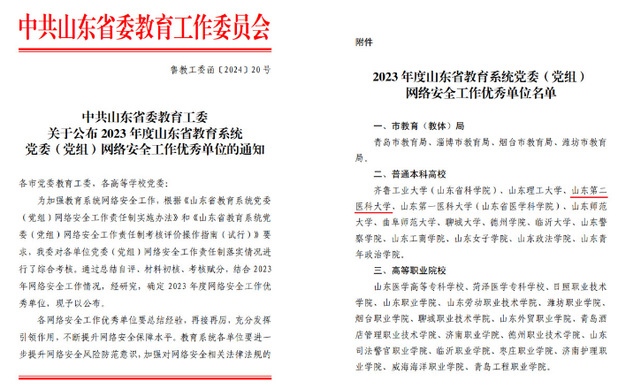 近日,中共山东省委教育工委公布了全省教育系统2023年度网络安全工作优秀单位的评选结果,必赢242net官网以优异成绩荣获优秀单位称号,是十四所本科高校之一,这也是必赢官网连续两年获此荣誉。