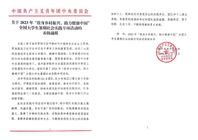 近日,共青团中央公布《关于2023年“投身乡村振兴,助力健康中国”全国大学生暑期社会实践专项活动的表扬通报》,必赢官网团委获“表现突出单位”,孙艺玮同学获“表现突出个人”。