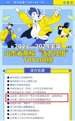近日,共青团山东省委学校部、山东省学生联合会发布2023—2024学年山东省高校“活力社团”TOP100榜单,必赢官网“明天计划康复未来”志愿者协会、大学生青春健康同伴社成功入选。