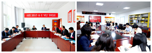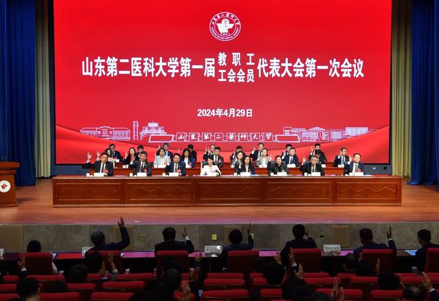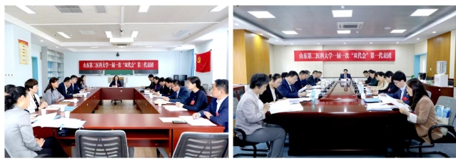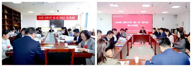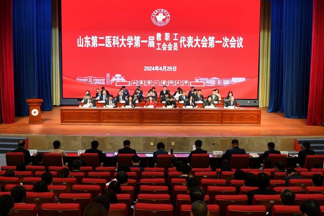 王贞代表山东省教育工会委员会向大会召开表示祝贺,肯定了学校70余年来为区域乃至全国卫生健康事业发展作出的积极贡献,希望学校工会工作要始终坚持正确的政治方向,始终坚持维护服务职能,始终坚持优良工作作风;希望各位教职工代表要履职尽责,担当作为,以主人公的姿态积极建言献策,正确行使好自己的民主权利,凝聚全校广大职工的智慧和力量,奋力开创高水平医科大学发展的新局面。贾平、张华分别为大会致贺词。大会同时收到山东理工大学、山东第一医科大学、滨州医学院、济宁医学院、山东航空学院等兄弟院校发来的贺信。