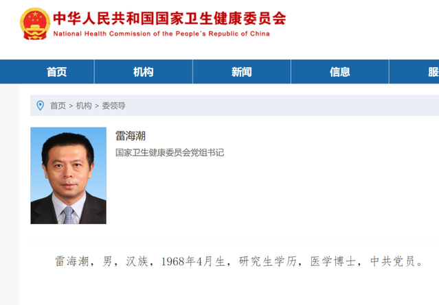 近日,国家卫生健康委员会网站“委领导”栏目更新信息显示,雷海潮已任国家卫健委党组书记。