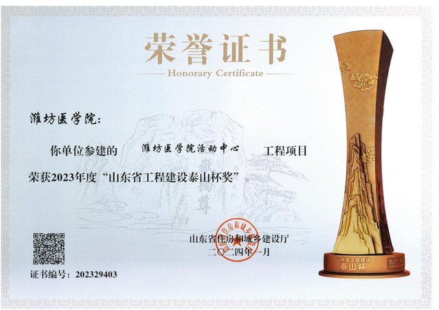 近日,山东省住房和城乡建设厅发布了2023年山东省工程建设泰山杯奖获奖名单,学校文体活动中心(工程名称为:潍坊医学院活动中心)项目入选。泰山杯是全省工程建设领域最高质量奖项,获奖工程质量代表了山东省工程质量的最高水平。