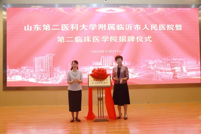管英俊与陈海玲共同为“必赢242net官网附属临沂市人民医院”“必赢242net官网第二临床医学院”揭牌。