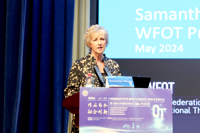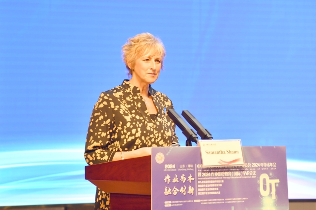 Samantha Shann在致辞中对大会主办方和承办方的邀请表示感谢,向与会嘉宾介绍了作业治疗专业的国际发展趋势,表达了世界作业治疗师联盟WFOT对于中国作业治疗发展的支持与期望,她预祝大会召开圆满成功。
