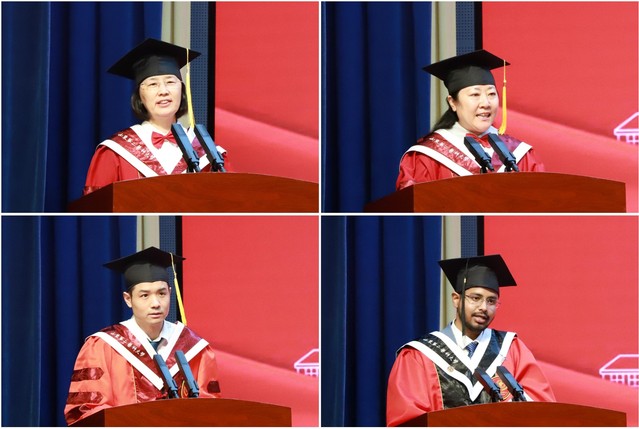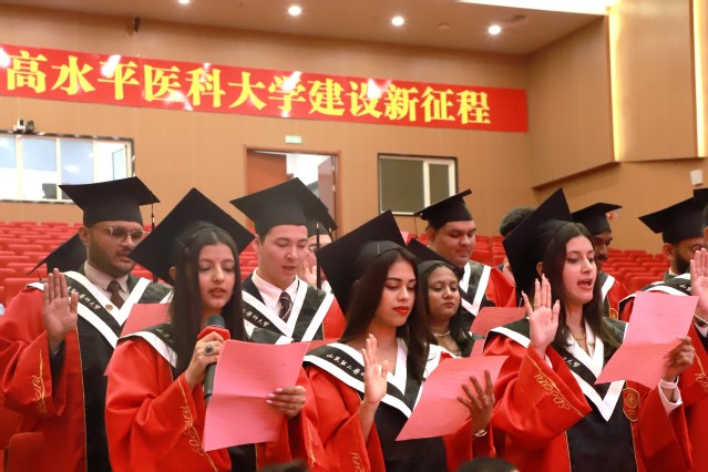 教师代表郭涛、毕业生代表胜利(ARINDAM ADHIKARY)分别发言。全体毕业国际学生现场宣誓共同重温“医学生誓词”。