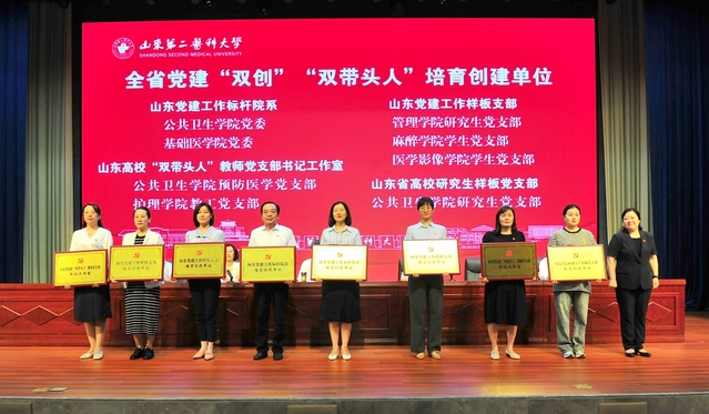 校领导为全国全省党建工作“双创”单位授牌,为受学校表彰的优秀共产党员、优秀党务工作者、先进基层党组织代表颁发证书和奖牌。