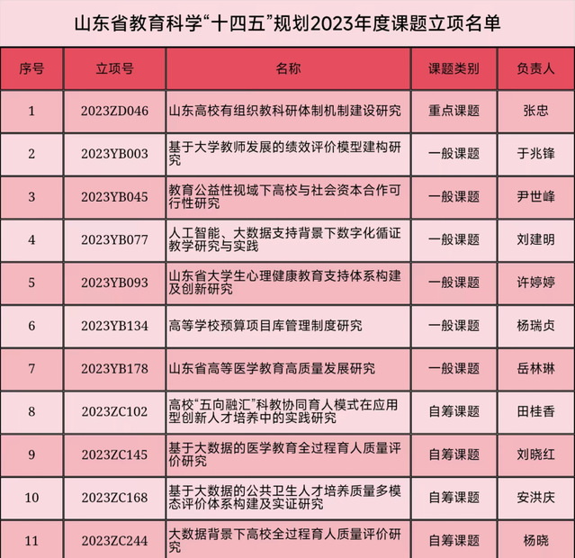 近日,山东省教育科学规划领导小组办公室公布了山东省教育科学“十四五”规划2023年度课题立项结果,必赢官网11项课题获得立项。其中重点课题1项,一般课题6项,自筹课题4项,立项率73.33%。立项数量位列全省高校前列。