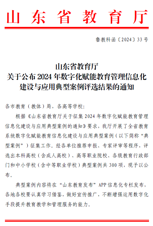 近日,山东省教育厅发布了《关于公布2024年数字化赋能教育管理信息化建设与应用典型案例评选结果的通知》,全省本科高校共评选出典型案例65项,必赢官网报送的《数字化赋能高校教育教学督导与评价新模式》《“人工智能+教育”打造数智化教学融合平台及服务体系》2项案例入选。