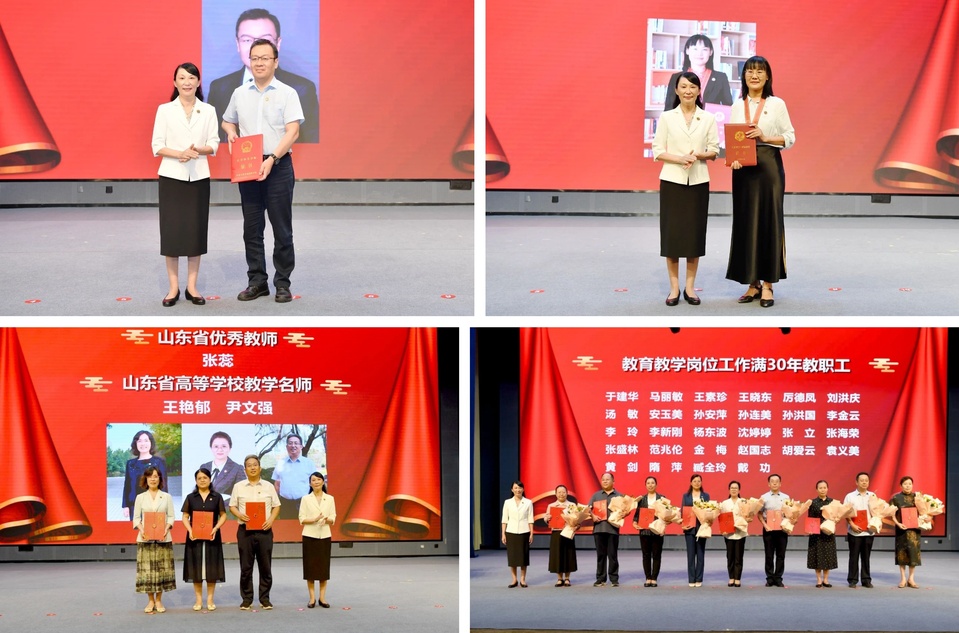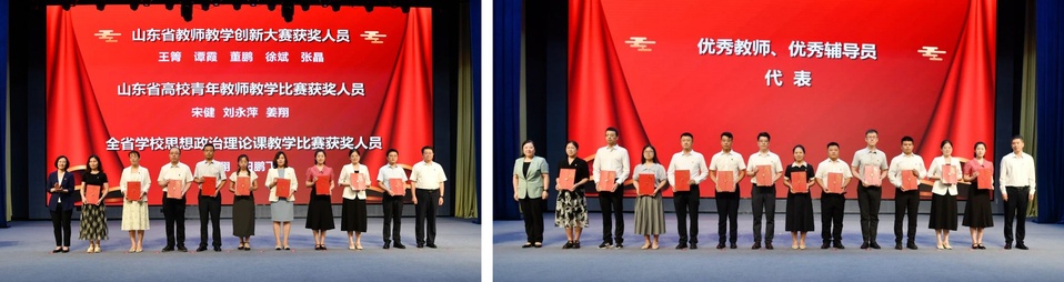学校对山东省教师教学创新大赛、青年教师教学比赛和全省学校思想政治理论课教学比赛的获奖教师,学校优秀教师、优秀辅导员、先进工作者,以及实践教学先进集体及个人代表进行了表彰。