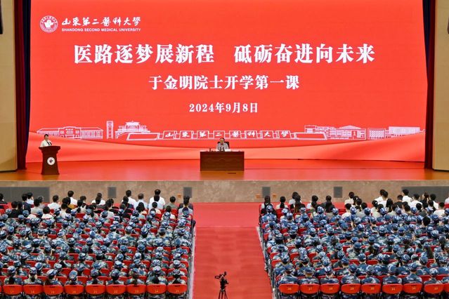 在热烈的掌声中,于金明院士作了题为《医路逐梦展新程,砥砺奋进向未来》的精彩报告。面对学校更名后迎来的2024级新生,于院士深情地与同学们分享了自己在母校的亲身经历与奋斗历程。