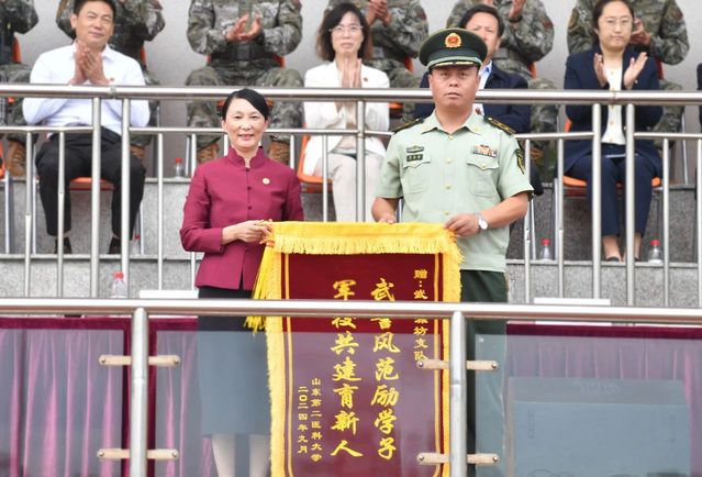 校长管英俊为武警潍坊支队赠送锦旗,感谢全体教官的精心指导与辛勤付出。