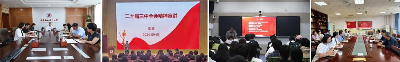 党的二十届三中全会召开以来,学校党委按照中央、省委部署积极谋划落实,组成学校党政领导班子成员、思政课专职教师、各党总支(党委)班子成员和党支部书记、组织员以及辅导员参与的校内四级宣讲,迅速兴起学习宣传贯彻热潮。下一步,学校将把学习宣传贯彻全会精神与习近平总书记视察山东重要讲话精神、习近平总书记在全国教育大会上的重要讲话精神结合起来,与贯彻落实学校第四次党代会精神结合起来,更好地用全会精神指导解决实际问题、总结实践经验、推进中心工作,奋力推进学校各项事业高质量发展,办好人民满意的医学教育。
