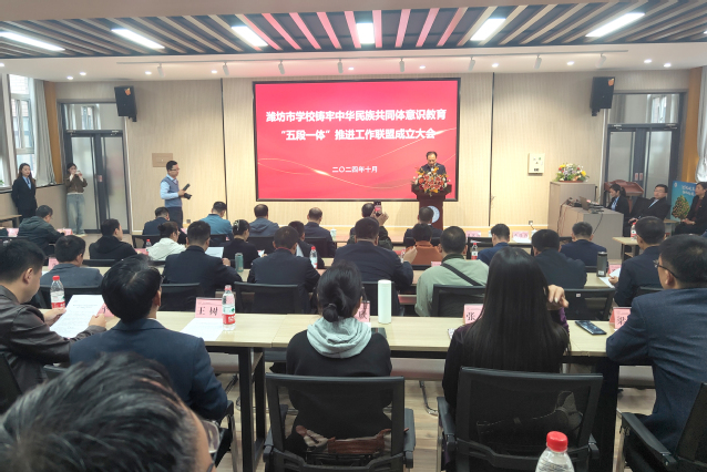 10月30日,潍坊市学校铸牢中华民族共同体意识教育“五段一体”推进工作联盟成立大会在青州市召开。中共潍坊市委教育工委副书记周书坤,市委统战部副部长、市民族宗教事务局局长丁建营出席成立大会。必赢官网当选为工作联盟理事长单位,党委委员、统战部长刘汉波当选为理事长。