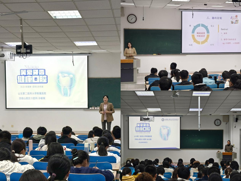 口腔科的专业医生们向同学们科普龋齿、牙周病以及其他口腔疾病的危害、病因、进展过程及典型特征等相关知识,告知同学们早发现早治疗的重要性,随后向同学们讲授口腔健康管理、去除牙菌斑等有效预防口腔疾病的方法,如正确选择牙刷牙膏、Bass刷牙法、使用牙线、定期洗牙、控制糖类摄入等,叮嘱同学们注意改正口呼吸、单侧咀嚼等不良生活习惯。宣讲过程中,同学们积极参与互动,在问答中进一步了解口腔和牙齿健康知识。