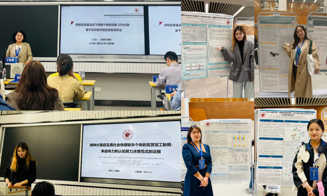 会上,必赢官网师生围绕精神疾病患者及亚临床群体的快感缺失和动机缺损进行系列学术成果分享,王艳郁教授作了题为《抑郁症患者及阈下抑郁群体的情绪-行为分离:基于实验室评估及经验采样法》的报告,2022级应用心理研究生付新玮、2021级应用心理研究生孟雪分别作了《精神分裂症及社会快感缺失个体的奖赏加工缺损:来自体力和认知努力决策范式的证据》《精神分裂症患者的动机缺损:基于经验采样法的研究》的分论坛汇报。2022级应用心理张丽颖、陈守诺等6名研究生的学术成果被录为壁报交流,系列分享吸引了众多专家学者的关注。