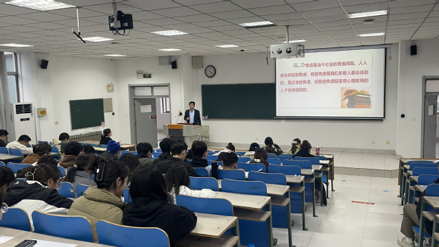 刘宪亮让同学们现场绘制“雨中人”图像,初步分析同学们当下的心理压力状况,进而以“如何应对考试压力”为题,与即将参与研究生考试的同学进行交流。他通过对比考试焦虑与其他焦虑的区别,带领同学们了解考试焦虑出现的原因、表现,并就如何缓解压力提出了建议。最后他以“人生没有白走的路,每一步都算数。愿你平和从容,也祝你得偿所愿”为结束语,向同学们送上祝福。