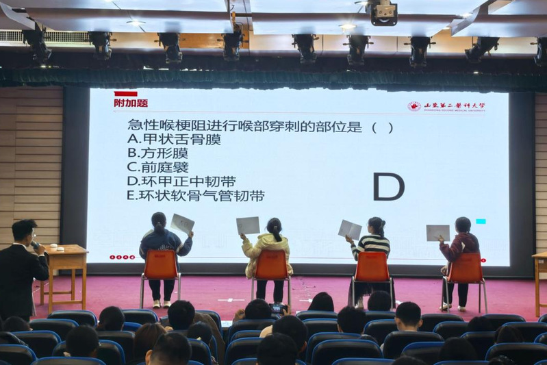 竞赛分初赛和决赛两个部分。初赛由人体解剖学教研室命题,选手通过人卫教学助手APP进行线上答题,根据成绩选拔30名同学晋级决赛。决赛包括个人现场作答、团队协商作答、抢答三个环节,题目类型包含选择题、线索描述以及案例分析等,旨在全面检验选手对解剖学知识的掌握程度。参赛者沉稳答题,谨慎思考,灵活应变,最终比赛评选出一等奖1名、二等奖3名、三等奖5名。