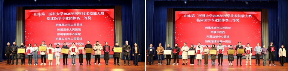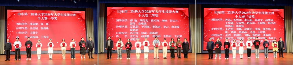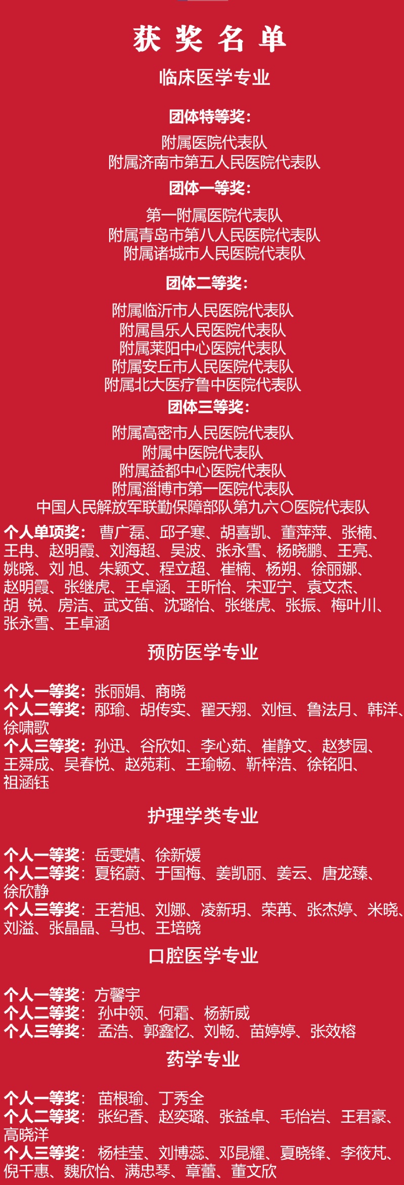 大赛共评出临床医学专业团体赛特等奖2个、一等奖3个、二等奖5个、三等奖5个,预防医学、护理学类、口腔医学及药学专业个人赛共评出一等奖7名,二等奖22名,三等奖37名,单项奖和优秀奖108名。