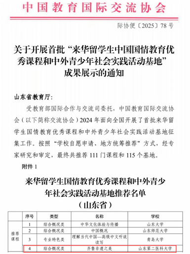 学校始终重视国情教育,积极整合校内外优质文化资源,开展了“走进非遗”“读懂中国”等系列文化体验活动,让国际学生在沉浸式体验中感受非遗文化的魅力,感知真实、立体、全面的中国形象。此次《齐鲁非遗之美》课程入选教育部优秀课程名单,标志着学校在教育国际化创新实践领域取得了突破性进展。下一步学校将继续深化中华优秀传统文化教育的内涵式发展,创新教学方法,丰富教学资源,持续擦亮“留学山二医”育人品牌,培养更多知华、友华、爱华的优秀国际医学人才和文化友好使者,为讲好中国故事、传播中华文明贡献山二医智慧和力量。