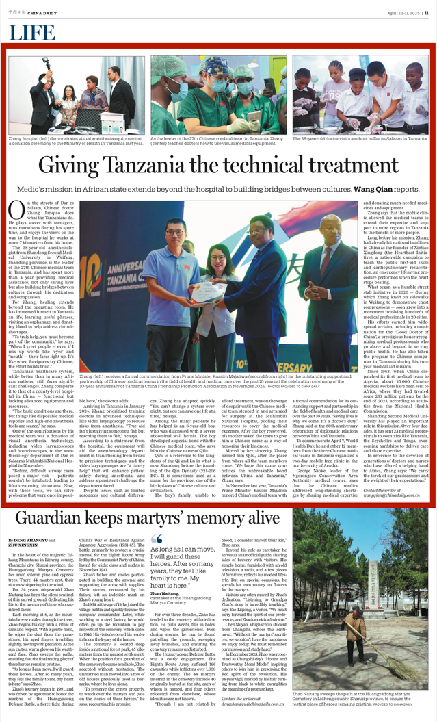 4月12日,《中国日报》(China Daily)以Giving Tanzania the technical treatment为题,报道必赢官网援外医疗队员张军桥在坦桑尼亚勇担医者使命、巩固中非友谊的动人事迹。
