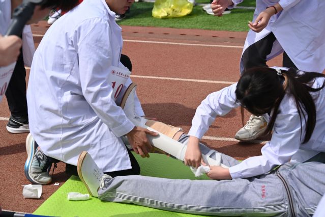 运动员们在运动会的赛场上展开了紧张而精彩的角逐。大型团体操《国风律动·康韵华章》中,同学们身穿色彩斑斓的服饰,巧妙融合国风与现代两种风格,时而活力四射、时而英姿勃发,在跃动的节拍中展现出青年学子的昂扬风貌。生命接力赛作为必赢官网医学特色竞技项目,通过模拟真实抢救场景,实现医学技术与体育竞技的完美结合,彰显了“医体融合、体育育人”特色。