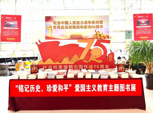 今年是中国人民抗日战争暨世界反法西斯战争胜利80周年,也是抗美援朝出国作战75周年。为激励师生铭记历史、缅怀先烈、珍爱和平、开创未来,在第30个“世界读书日”到来之际,图书馆围绕全环境立德树人根本任务,于二楼大厅推出爱国主义教育主题图书展。