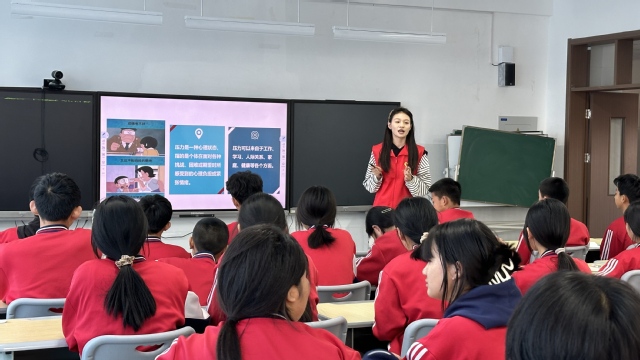 座谈中,双方就加强校校合作,以大学生专业力量护航青少年心理健康发展进行深入讨论。学生志愿者为全体初二学生讲授“与压力共舞”心理健康课。山东省大学生心理学应用技能大赛教学创新赛道一等奖获得者张明扬结合中学生考前常见的身心反应,以互动游戏开启破冰环节;志愿者利用情景案例和互动游戏,从什么是压力、压力是敌是友以及解压小秘诀等多个角度,引导学生以积极乐观的情绪状态面对考试,缓解考前焦虑与紧张情绪。