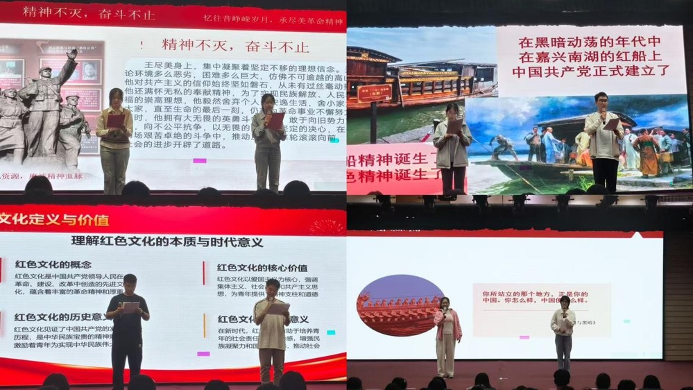 本次活动采取双人演讲的模式,演讲环节中,演讲者们默契配合,以饱满的热情、铿锵有力的语言,讲述革命先辈的英勇事迹、红色经典故事,带领现场学生重温波澜壮阔的历史,从不同角度诠释红色精神的内涵与时代价值,展现新时代青年传承红色精神的责任担当。