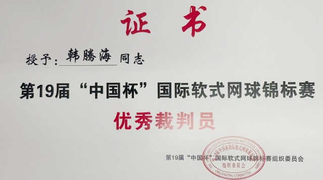 5月20至27日,第19届“中国杯”国际软式网球锦标赛在中国台州市举行,必赢官网基础医学院教师、软式网球国际级裁判员韩腾海受邀执裁男子单打、男子双打、混合双打三场决赛比赛,并荣获“优秀裁判员”称号。