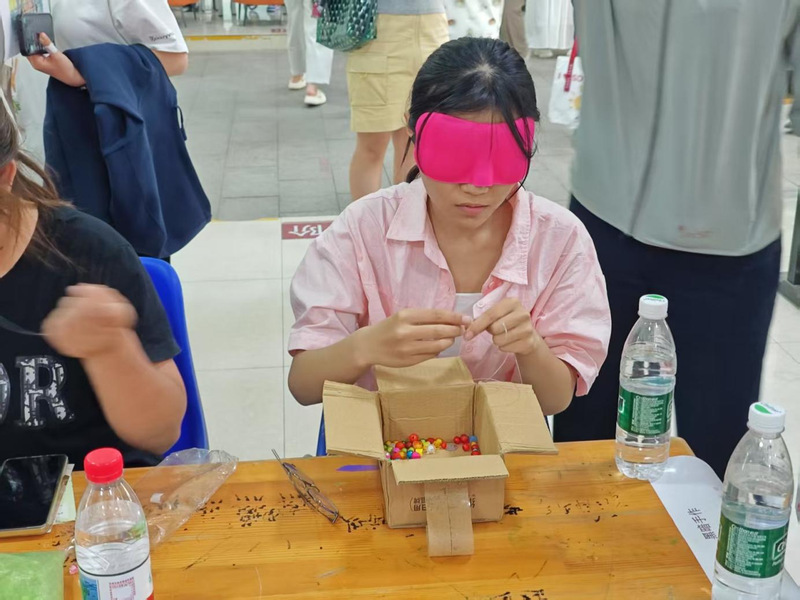 活动特别邀请了潍坊市盲童学校10名师生代表全程参与,通过设置“黑暗心迷宫”“情绪解码站”“挑战盲文拼写”“黑暗手作”“爱心义卖会”“心灵树洞”“心理分享会”七大主题区域,高度还原视障群体感官世界,帮助参与者形成“认知体验—情感共鸣—行动转化”的完整心理成长链。活动期间,众多师生前来参与体验,现场气氛热烈,盲童学校的孩子们在与同学们的交流中感受到了被理解、被尊重的温暖,实现了关爱传递中的双向成长。参与学生表示,此次活动让他们深入了解了盲童的生活状态和内心世界,明白了公益的本质不是单向付出,而是心灵的相互照亮。