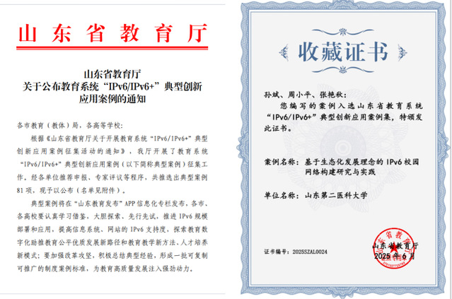 近日,山东省教育厅公布了教育系统“IPv6/IPv6+”典型创新应用案例评选结果,必赢官网报送的《基于生态化发展理念的 IPv6 校园网络构建研究与实践》成功入选。