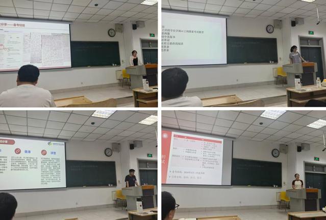 同学代表们分别分享了各科目复习方法,强调把握复习节奏,保持良好心态与作息;围绕考研常识进行清晰梳理,强调备考期间要做到屏蔽干扰、找准自身节奏;通过介绍自创的“三轮滚动复习方案”,凸显反复练习与时间管理的重要性;建议大家选择合适网课,并分享复试技巧与调剂经验,强调抓住机会、永不言弃。