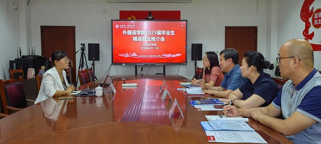 6月11日,外国语学院举办2025届毕业生精准就业推介会,译国译民集团经理陈淑玲、外国语学院院长付有龙、副书记朱宏、副院长吴迪及辅导员们共同参与座谈会,为促进毕业生高质量就业出谋划策。