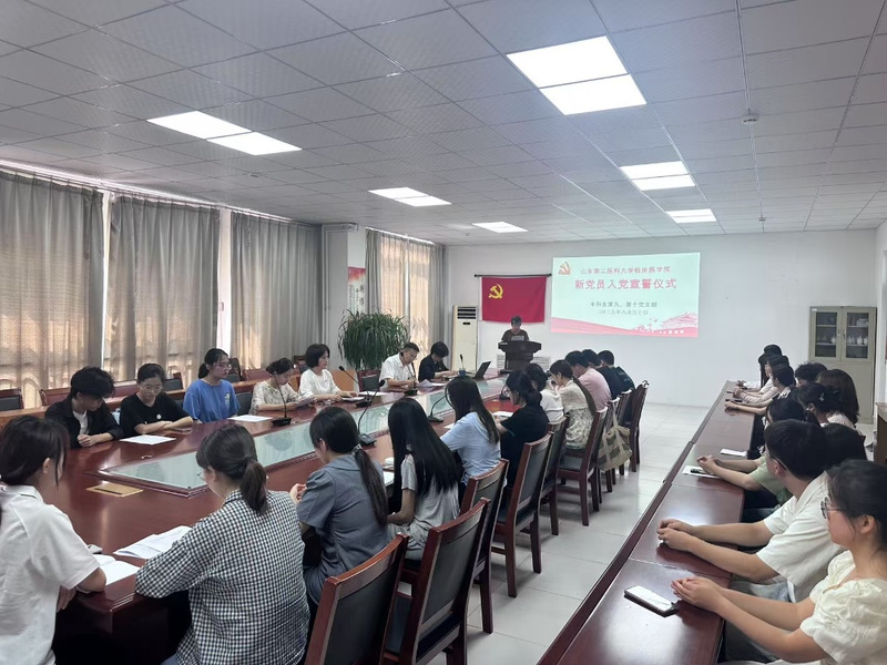 雄壮的《国际歌》奏响仪式序幕。徐海英在致辞中深情回顾党的百年伟业,强调全体党员要立足岗位、服务师生,从解决实际问题做起,为学院发展和学校高水平医科大学建设贡献先锋力量。刘刚向新接收的预备党员表示祝贺,并提出三点期望:一要永葆党员本色,终身坚守身份认同;二要筑牢思想根基,将党的创新理论内化于心、外化于行;三要争当时代先锋,在科技创新、社会服务等领域展现青年担当。教师党员宣读新党员名单,老党员为新党员郑重佩戴党徽。在第十党支部书记的领誓下,13名新党员面向党旗庄严宣誓,老党员重温入党誓词,铿锵誓言回荡会场,彰显对党的忠诚与为共产主义事业奋斗终身的坚定信念。新党员代表在表态发言中表示,将以学铸魂深化理论武装、以干促行投身实践服务、以德为先永葆先进本色,做红色基因传承者、攻坚克难奋斗者、扎根基层奉献者。仪式最后集体观看专题片《精神的追寻——伟大建党精神》。