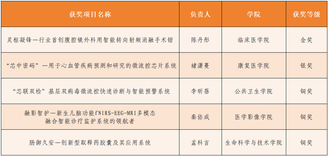 其中临床医学院《灵枢凝锋—行业首创腹腔镜外科用智能转向射频消融手术钳》项目摘得省金;康复医学院《“芯中密码”一用于心血管疾病预测和研究的微流控芯片系统》荣获省银;公共卫生学院《“芯联双检”基层双病毒微流控快速诊断与智能预警系统》、医学影像学院《融影智护—新生儿脑功能fNIRS-EEG-MRI多模态融合智能诊疗监护系统的领航者》、生命科学与技术学院《肠御久安—创新型取释药胶囊及其应用系统》分别获主赛道、产业赛道铜奖。这一成绩是学校深耕创新创业教育的缩影,学校将持续搭建跨学科创新平台,推动更多医学成果从实验室走向临床,在更高赛事舞台书写创新答卷。