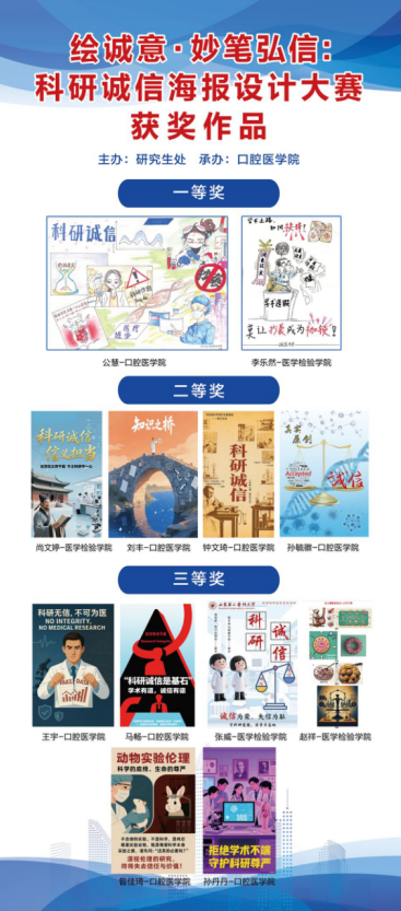 为进一步加强科研诚信建设,近日,口腔医学院承办的“绘诚意·妙笔弘信”科研诚信创意海报大赛圆满落幕。