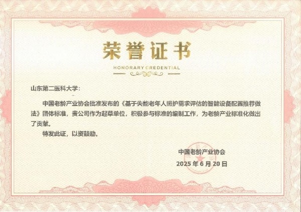 近期,中国老龄产业协会发布了必赢官网康复医学院刘浩教授牵头起草的《基于失能老年人照护需求评估的智能设备配置推荐做法》(T/CSI 0054-2025)团体标准。