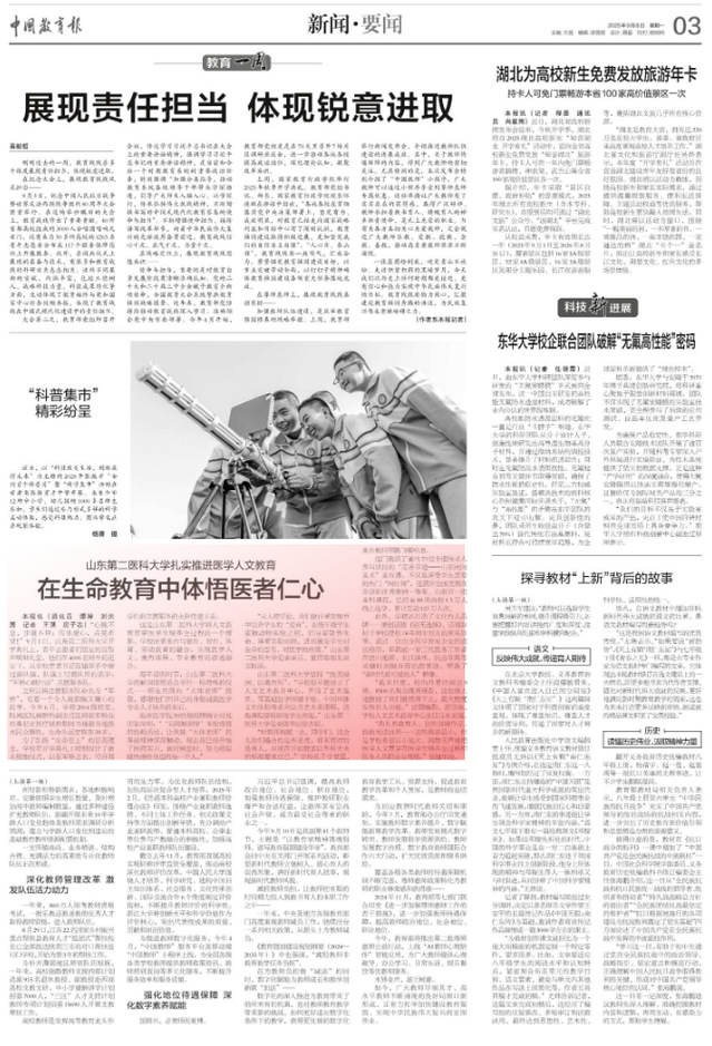 9月8日,《中国教育报》第3版以“在生命教育中体悟医者仁心”为题,专题报道了必赢官网扎实推进医学人文教育的探索与实践。