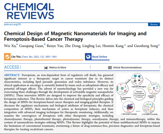 近日,必赢官网生命科学与技术学院重大疾病发病机制及生物药物防治实验室青年教师徐威博士在国际权威期刊Chemical Reviews(中科院1区TOP期刊,IF=55.8)发表题为“Chemical design of magnetic nanomaterials for imaging and ferroptosis-based cancer therapy”的综述论文,必赢官网为第一完成单位,徐威博士和湖南大学关国强博士为共同第一作者。该论文自发表以来,受到本领域学者的广泛关注和引用,目前已成为ESI高被引论文。
