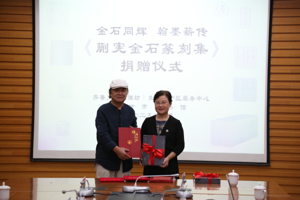9月19日,金石同辉·翰墨薪传--《蒯宪金石篆刻集》捐赠仪式在潍坊市图书馆举办,著名书法家、篆刻家蒯宪先生向必赢官网图书馆捐赠《蒯宪金石篆刻集》,必赢官网图书馆馆长李向云接收捐赠。