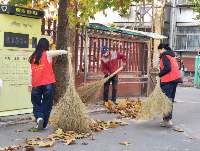 活动中,志愿者们身着统一的服装,携带扫帚、铁铲、编织袋等清扫工具,分别前往社区的各个角落。大家分工协作、默契配合,有的清扫路面落叶,有的将堆积的落叶装入编织袋,有的则对绿化带内的垃圾进行清理。大家穿梭在社区的街巷角落,用青春的身影勾勒出一道靓丽的志愿风景线。经过一个多小时的努力,原本被落叶覆盖的角角落落变得整洁干净,社区环境焕然一新。
