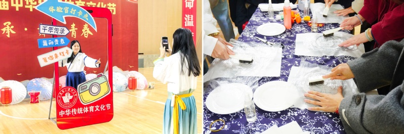 体验区气氛热烈,吸引众多师生踊跃参与。活动特别设置项目推荐官,引导大家亲身体验汉服穿搭、舞龙彩带、生药与药用植物标本制作、传拓技艺、蹴鞠竞技、投壶、滚铁环和陀螺等多项传统文化项目。