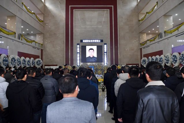 清晨8时,张军桥烈士送迎仪式在潍坊市殡仪馆举行。仪式厅内悬挂着张军桥烈士遗像,庄重的国旗覆盖在张军桥烈士骨灰盒上,周围放满了花篮、花圈。全场奏唱国歌,集体默哀致敬。