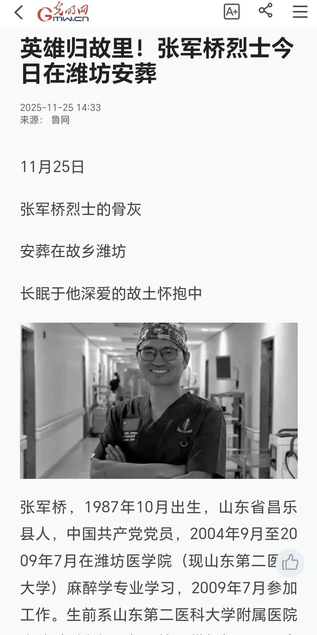 青山垂首,松涛呜咽。2025年11月25日,张军桥烈士安葬仪式在山东潍坊庄重举行,千余名群众自发肃立,送别这位用生命践行大爱的英雄。山二医师生、昔日同窗与同事排成长队含泪敬礼,市民们手捧白菊、怀揣手写卡片,寄托无尽哀思。截至11月27日12时,新华社、人民日报、央视新闻、光明网等媒体刊发报道670余篇,短视频180余条,各省级媒体、商业网站及客户端信息410余条,微博话题270余条,总达1亿次的浏览热度。报道中不仅定格了他在坦桑尼亚达累斯萨拉姆海域舍己救人的英勇瞬间,更呈现了他从援鄂抗疫一线到发起“心跳行动”公益项目,从三甲医院麻醉医生到援坦医疗队队长的闪光足迹。各大媒体追光“军桥精神”,是对一位平凡英雄的集体致敬。 新华社视频号发布视频:“英雄虽逝 精神永存!”