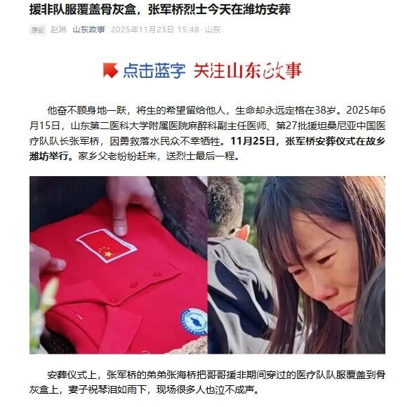山东政事公众号发布报道:“援非队服覆盖骨灰盒,张军桥烈士今天在潍坊安葬。”