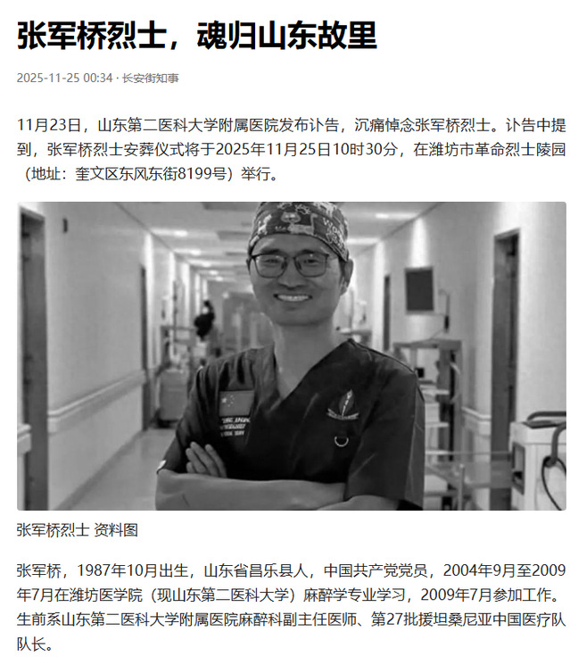 新华网视频号发布视频:“张军桥烈士安葬仪式在故乡山东潍坊举行。” 人民日报抖音号发布视频:“张军桥医生的骨灰安葬在故乡潍坊。斯人已逝,大爱永存。致敬!”