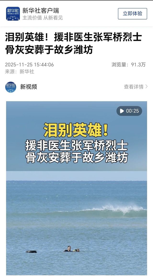 新华社客户端发布报道:“泪别英雄!援非医生张军桥烈士骨灰安葬于故乡潍坊。”