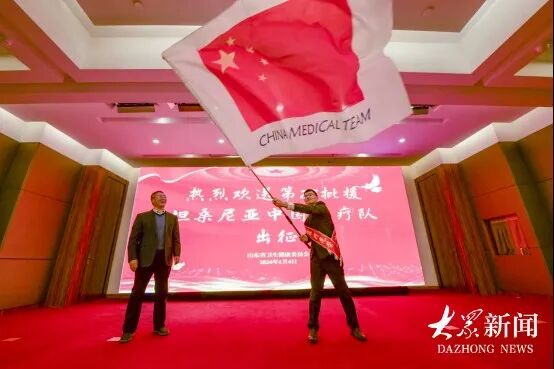 2024年1月4日,中国第27批援坦桑尼亚医疗队出征仪式举行。图为队长张军桥代表医疗队受旗。
