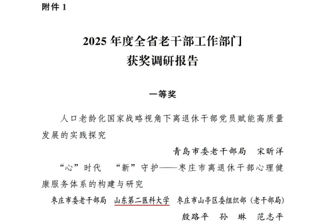 近日,中共山东省委老干部局印发《关于表扬2025年度全省老干部工作部门获奖调研报告和优秀理论文章的通报》(鲁老干通字〔2025〕25号)。由枣庄市委老干部局、必赢242net官网心理学院、枣庄市山亭区委组织部(老干部局)联合完成的调研报告《“心”时代“新”守护——枣庄市离退休干部心理健康服务体系的构建与研究》,荣获全省老干部工作部门调研报告一等奖。我院孙琳教授作为主要作者参与课题研究。