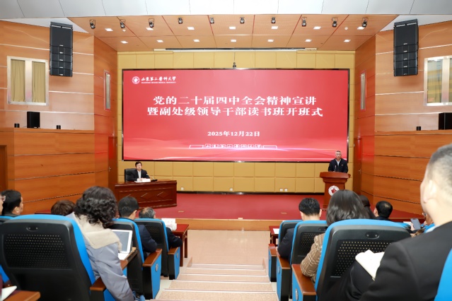 为深入学习贯彻党的二十届四中全会精神,12月22日,学校举办副处级领导干部学习贯彻党的二十届四中全会精神读书班开班式。党委书记张建华以《锚定强国坐标 深耕医学沃土——以党的二十届四中全会精神引领学校事业高质量发展》为题作宣讲报告。副校长田玉胜主持会议。学校党政领导班子成员、全体处级干部参加会议。